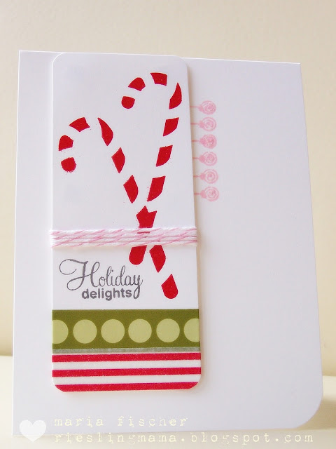 Sweets, twine, dots. Check. It helped when I saw my candy cane stamp and also decided to use the CASE This Sketch again! Heat embossed the candy cane and gave the little lollipops some Stickles to add some sweet shine.