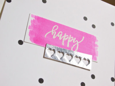Kept this one super CAS, just coloring a scrap with Copic RV04 and heat embossing half of the sentiment ("birthday" is on the inside). And the row of hearts is die cut from silver mirrored CS.
